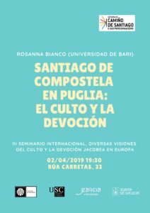La Cátedra del Camino de Santiago y las Peregrinaciones convoca una nueva cita en el Centro Internacional de Acogida al Peregrino. Tendrá lugar el día 2 de abril a las 19.30 horas en el aula Robert Plötz en la que la profesora Rosanna Bianco de la Universidad de Bari impartirá la sesión “Santiago de Compostela en Puglia: El culto y la devoción”.