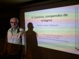 A las 19 horas de ayer comenzaba en el Hostal de los Reyes Católicos la conferencia El Calixtino, compendio de milagros que magistralmente impartía Ramón López Vázquez. La conferencia venía a completar las ya impartidas por el mismo investigador en años precedentes, El Calixtino: nociones básicas y El sermón Veneranda Dies, ¿una meditación para compostelanos?. El numeroso público asistente felicitó tras la misma al conferenciante que hizo girar su exposición sobre la misión de los milagros expuestos en el Calixtino y el más conocido de todos ellos: el milagro del ahorcado.