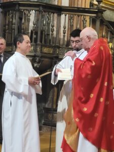 El pasado viernes, día 23 de mayo, la S.A.M.I. Catedral de Santiago celebró la Solemnidad de la Aparición del Apóstol Santiago en la batalla de Clavijo. Para unirse a la celebración, la Archicofradía Universal del Apóstol Santiago participó en la Eucaristía de 19.30 horas imponiendo la medalla a 30 nuevos cofrades provenientes de España, Portugal, Italia, Polonia, Alemania, Colombia y Países Bajos.